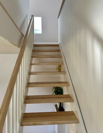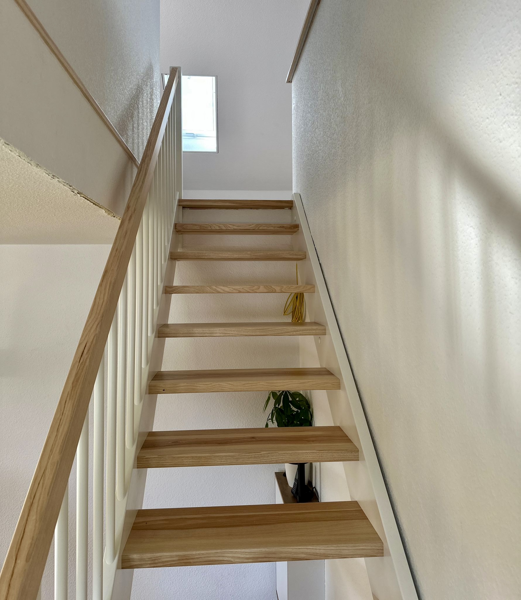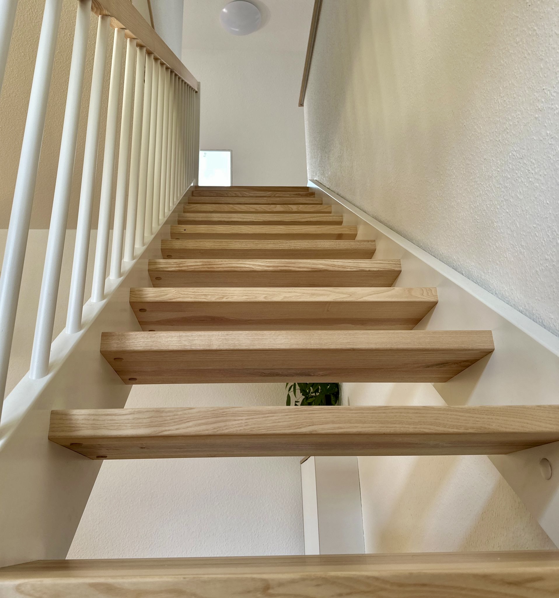 Modern & Handgefertigt. Diese offene Treppenkonstruktion verbindet handwerkliche Präzision mit zeitlosen Design. Die Kombination aus Weißlack, Eschenholz und klaren Linien schafft Leichtigkeit und Eleganz im Wohnraum. Ein echtes Statement im Innenraum – schlicht, funktional und stilvoll.