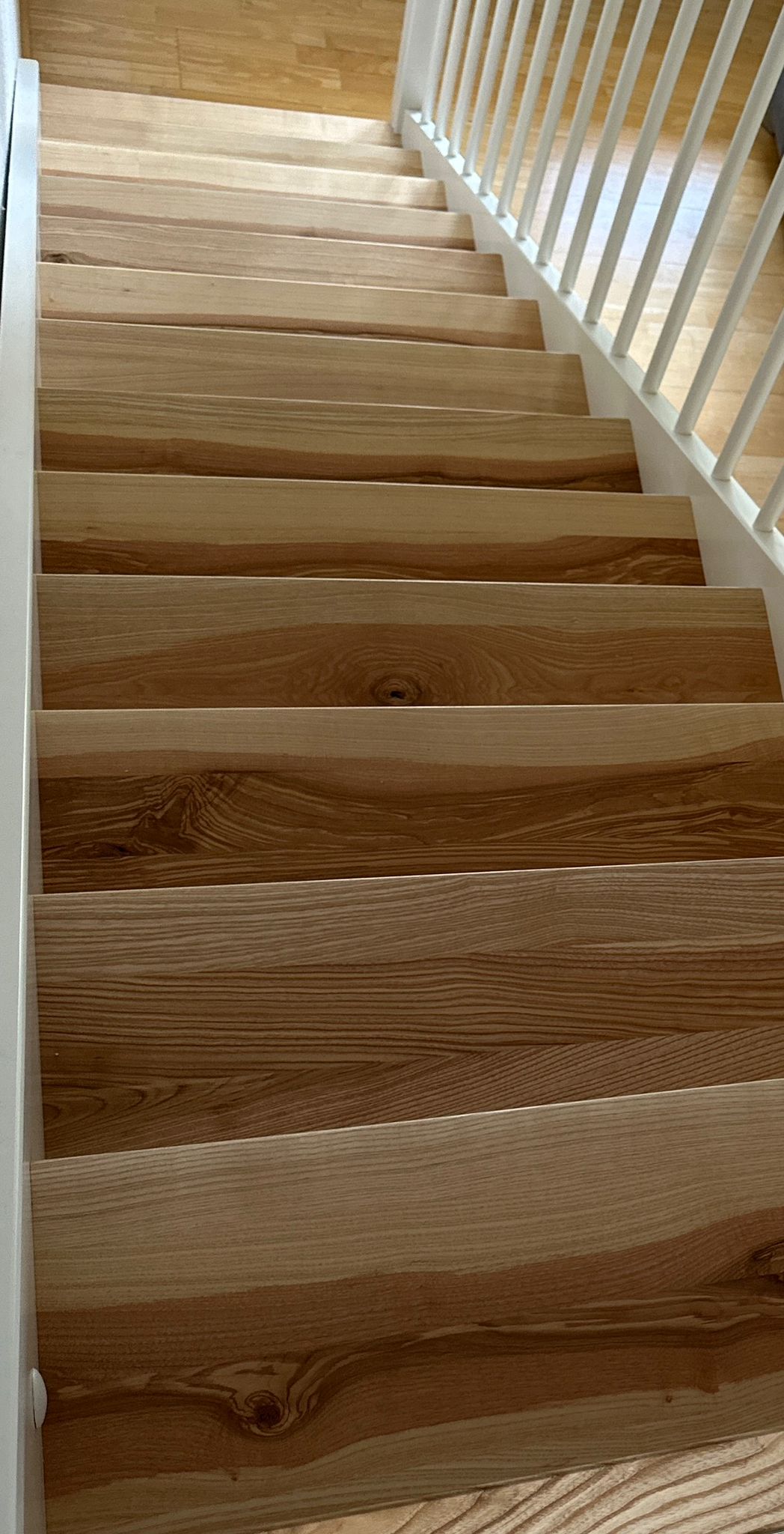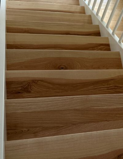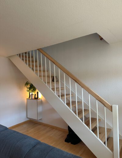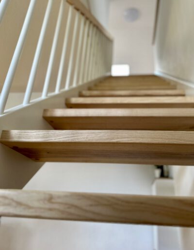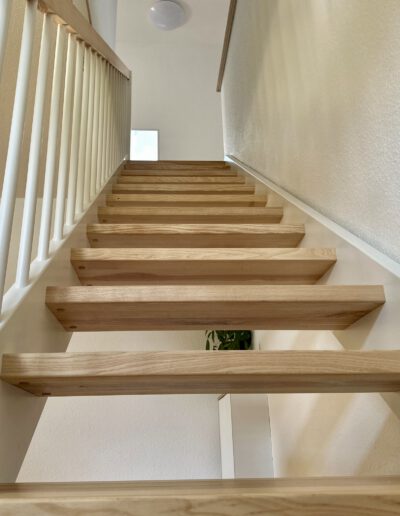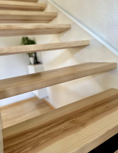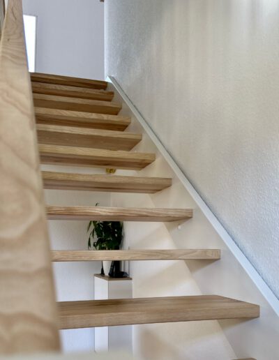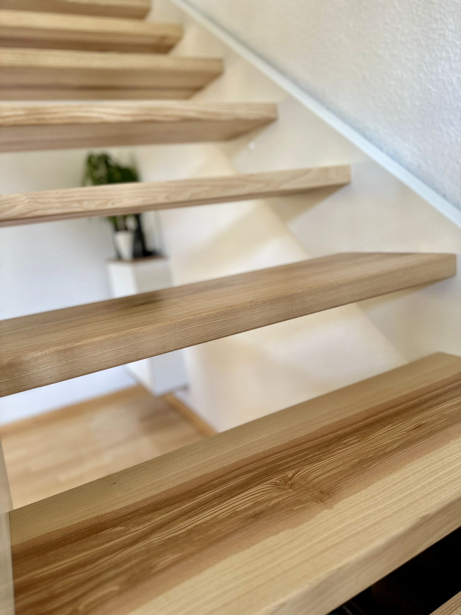 Modern & Handgefertigt. Diese offene Treppenkonstruktion verbindet handwerkliche Präzision mit zeitlosen Design. Die Kombination aus Weißlack, Eschenholz und klaren Linien schafft Leichtigkeit und Eleganz im Wohnraum. Ein echtes Statement im Innenraum – schlicht, funktional und stilvoll.
