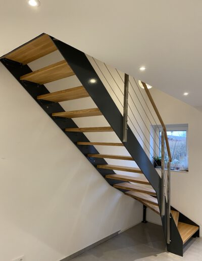 Diese Treppe vereint Stabilität und filigranes Design. Die robusten grau lackierten Stahlwangen bieten eine moderne, klare Linie, während die geölten Eichenstufen für ein angenehmes Gehgefühl und eine zeitlose Ästhetik sorgen. Abgerundet wird das Design durch ein Edelstahlgeländer mit filigranen Seilfüllungen und einem Handlauf aus Eiche, der perfekt zum Material der Stufen passt.