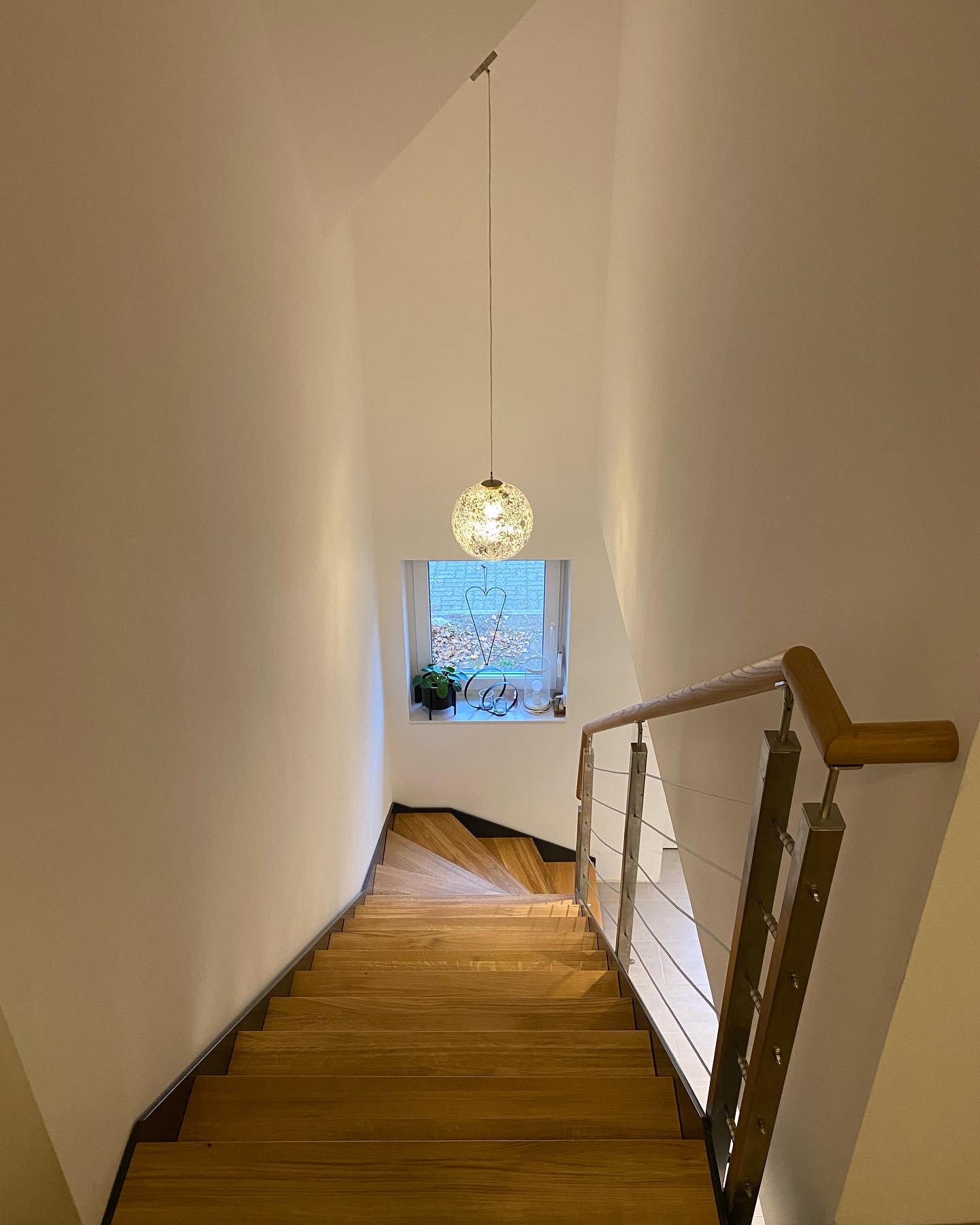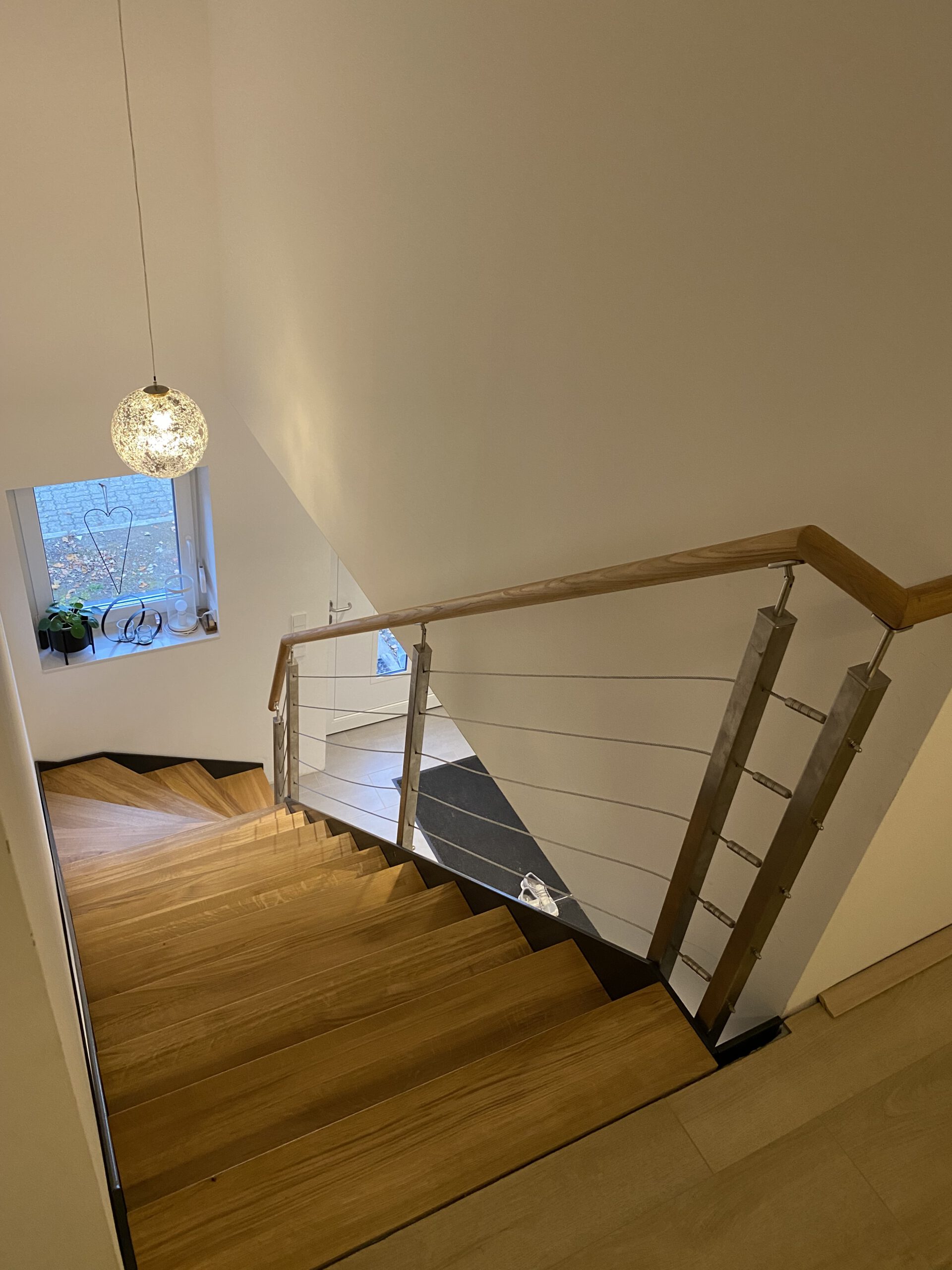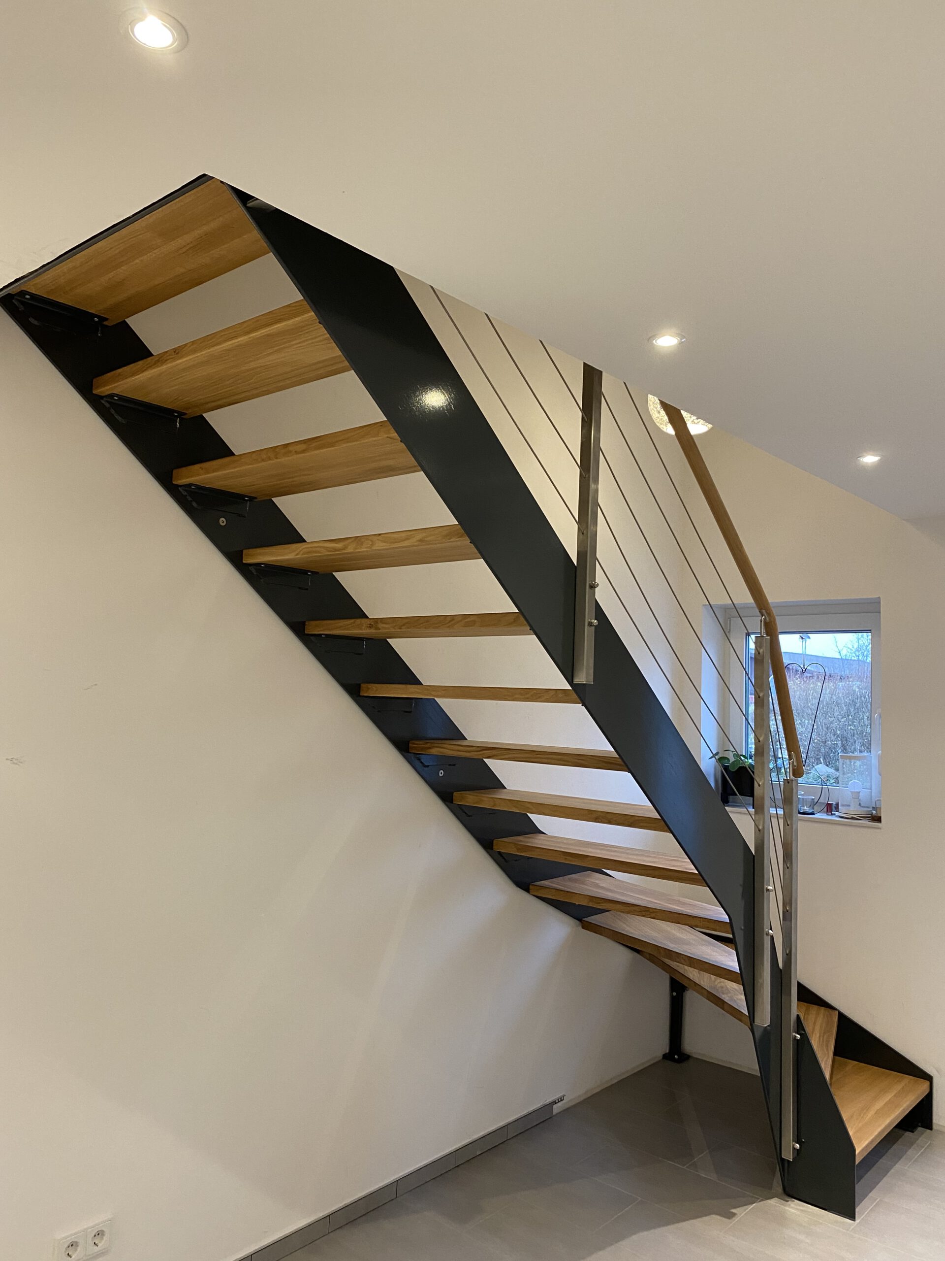 Diese Treppe vereint Stabilität und filigranes Design. Die robusten grau lackierten Stahlwangen bieten eine moderne, klare Linie, während die geölten Eichenstufen für ein angenehmes Gehgefühl und eine zeitlose Ästhetik sorgen. Abgerundet wird das Design durch ein Edelstahlgeländer mit filigranen Seilfüllungen und einem Handlauf aus Eiche, der perfekt zum Material der Stufen passt.