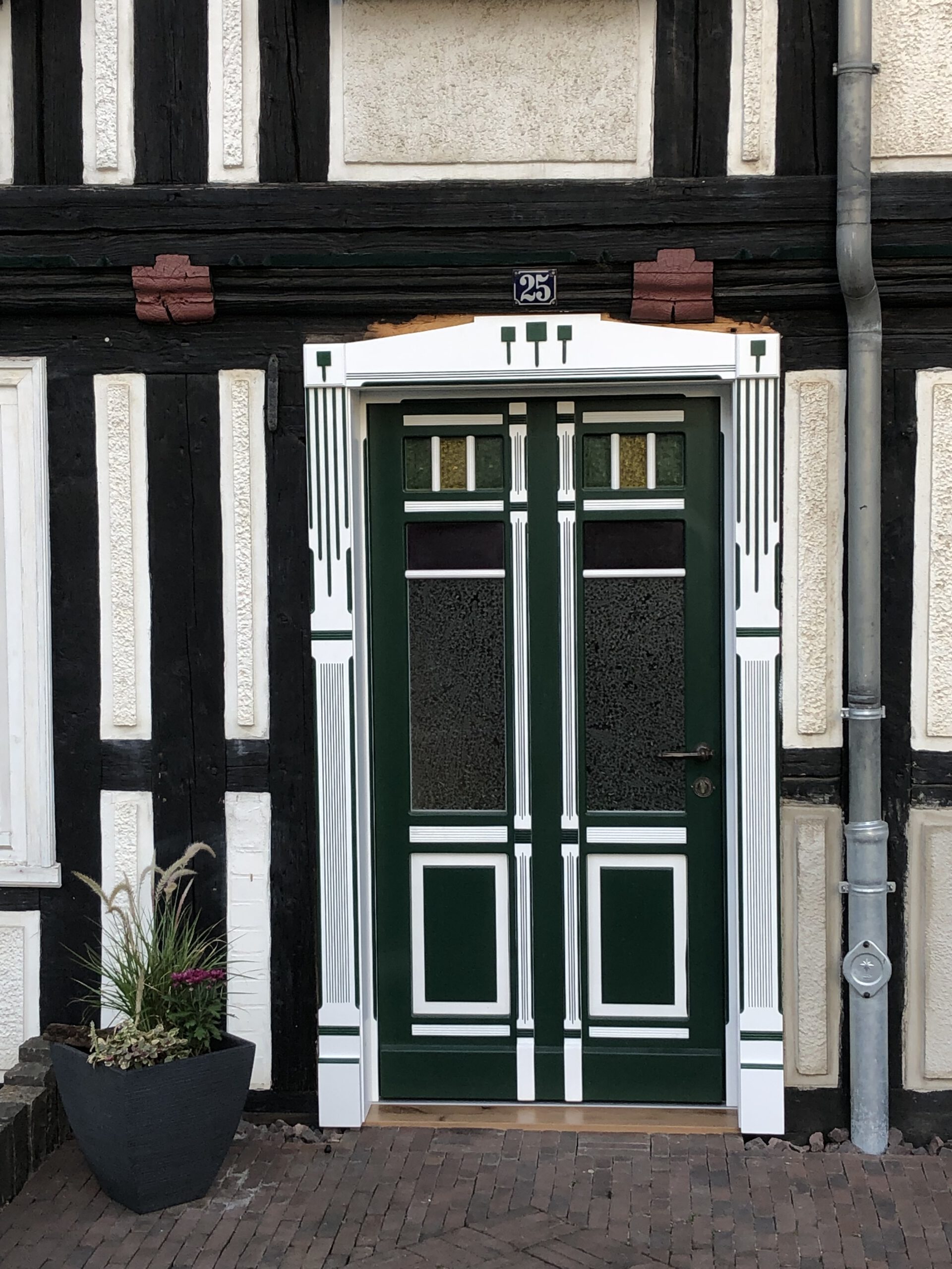 Die aufwendigen Zierfräsungen, die klassisch proportionierten Füllungen und die charakteristische Farbgestaltung wurden nach historischem Vorbild gefertigt. Gleichzeitig erfüllt die Tür heutige Anforderungen an Wärmedämmung, Sicherheit und Langlebigkeit.